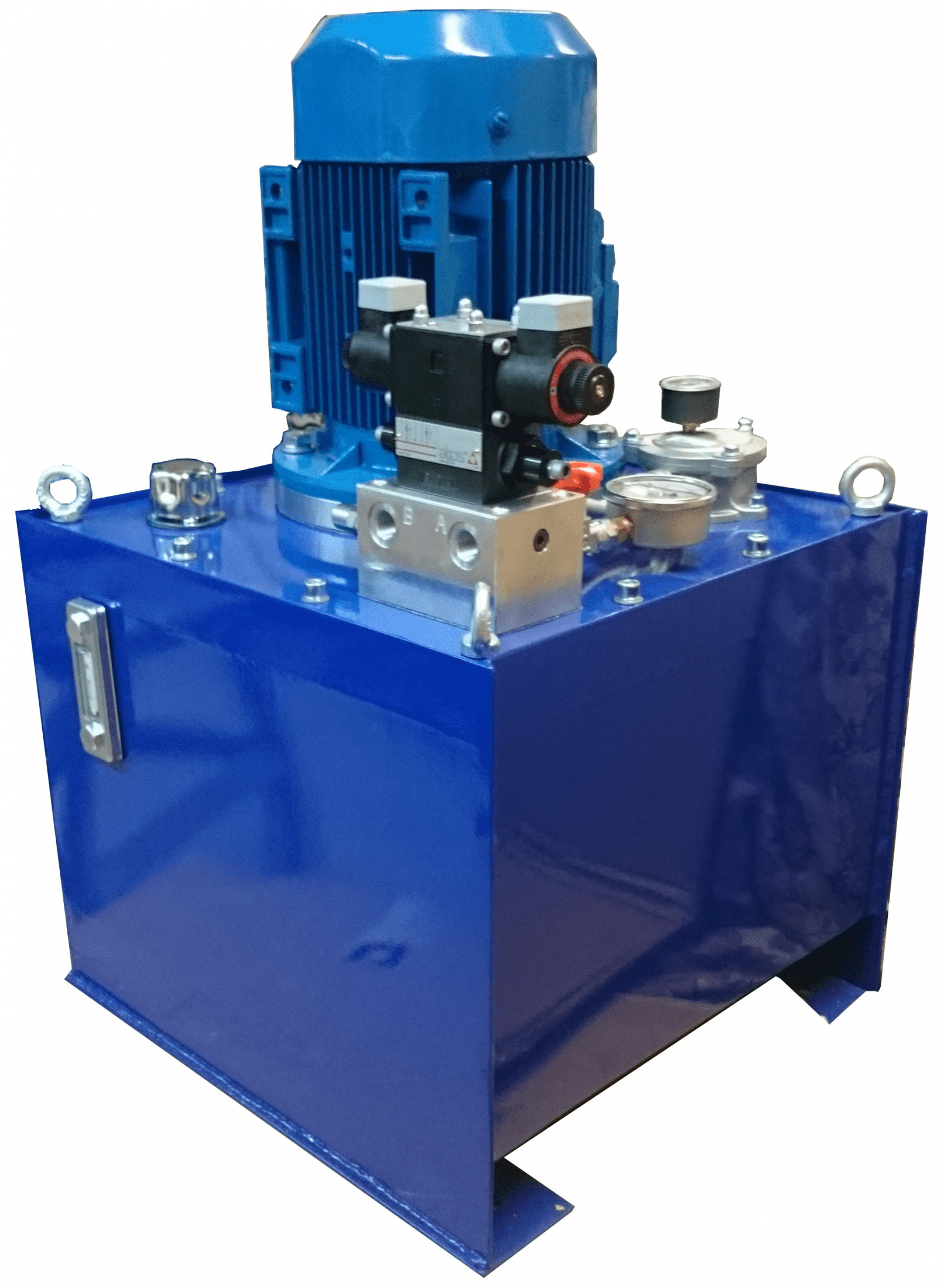 Гидростанция с гидравлическим цилиндром или несколькими цилиндрами – это комплект, состоящий из гидравлической насосной станции, рукавов высокого давления, элементов управления и распределения потока рабочей жидкости и исполнительного механизма с рабочим усилием до 200 тонн с ходом до 5 метров. Гидроцилиндр используется для совершения механической работы в виде прямолинейного перемещения нагрузки. Гидроцилиндр может создавать тяговое и толкающее усилие на штоке. Скорость перемещения штока определяется скоростью подачи гидростанции. Гидравлическая станция расчитана для подачи рабочей жидкости со скоростью от 1,6 до 50 л/мин, под давлением от 160 до 700 бар, емкость бака выбирается из диапазона от 10 до 250 литров в зависимости от объема и количества цилиндров.