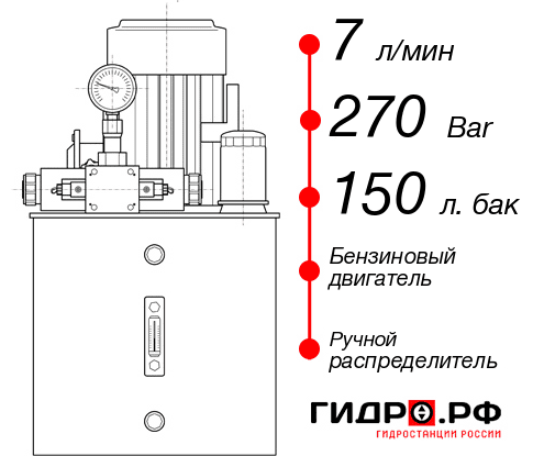 Гидростанция НБР-7И2715Т с гидравлическим контуром 7 л/м и давлением 270 bar. В конструкции используется бензиновый двигатель и масляный бак на 150 литров. Цена с доставкой до производства в Челябинске 181447 руб. Рекомендуемая комплетация: манометр электроконтактный, индикатор расхода, гидравлический замок с гидроуправлением.
