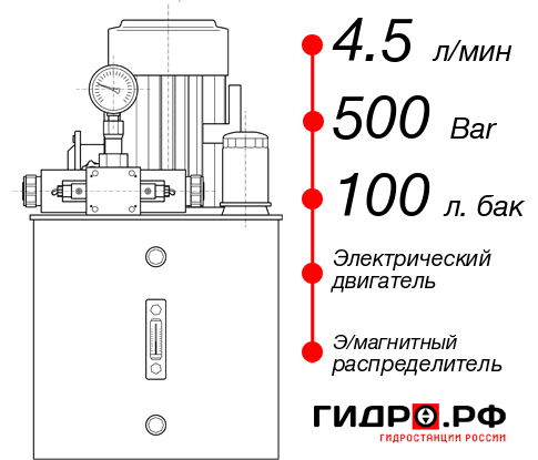 Гидравлическая станция НЭЭ-4,5И5010Т с давлением 500 бар и гидравлическим контуром 4.5 л/мин. В конструкции используется электрический мотор и гидробак на 100 литров. Срок производства до 3 дн. Цена по прайсу с доставкой до производства в Челябинске 321479 руб. Популярные дополнительные опции: электрокоробка специальная, установка тэна в бак, пульт радиоуправления, краны управления от 2 до 6 шт.